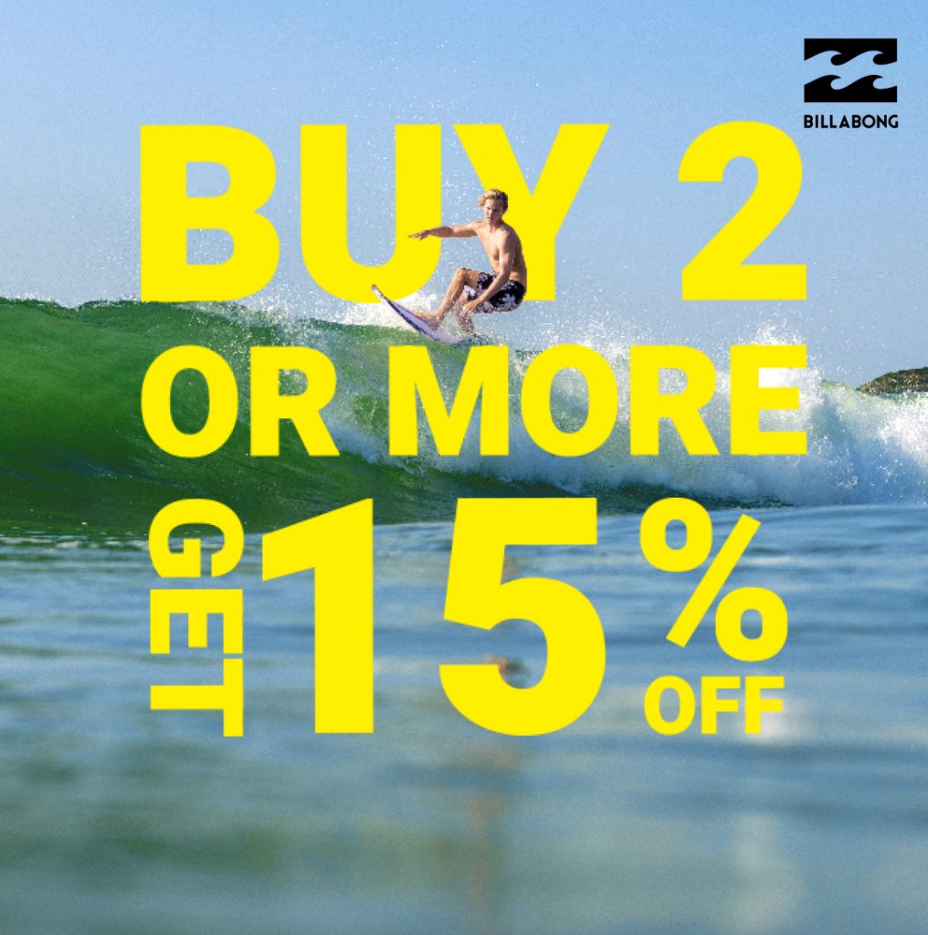 Discover the ultimate savings at Billabong! Elevate your style and save more when you shop with us. Take advantage of our exclusive offer: Purchase 2 or more items and unlock a fantastic 15% discount!